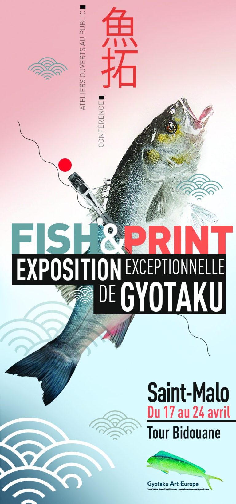Le Gyotaku, art de l’empreinte de poisson, est une tradition des pêcheurs japonais datant du 19ème siècle. Le poisson était recouvert d’encre de chine puis un papier était appliqué dessus pour prendre son empreinte. Sous l’impulsion de quelques artistes japonais dont Maître Matsunaga, cette pratique a donné naissance au gyotaku artistique dès le milieu du 20ème siècle.